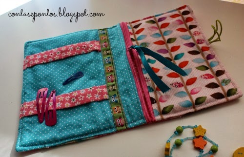 Quem tem meninas sabe que quando viajamos, quer sejam viagens mais curtas ou mais longas, há sempre um rol de acessórios para levar para além do vestuário básico. A pensar nesses momentos, a mãe da Matilde escolheu esta bolsa. Para fazer conjunto, mas sem que as bolsas fossem iguais, pediu-me para fazer outra um pouco maior e uma bolsa especial para transportar os ganchos e os elásticos. Eis o resultado!