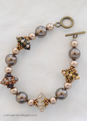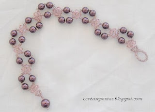 Com pérolas e cristais swarovski. Na primeira o fecho é também uma pérola, a segunda com um fecho metálico de cor bronze.